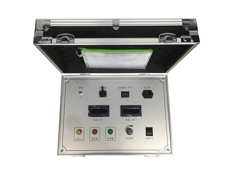 7、增設了高精度75%VDC-1mA的功能,做氧化鋅避雷器測量帶來方便。輕輕一按無須計算。本儀器控制箱上有75%的電壓功能鍵,在做避雷器試驗時,當電流升到1000uA時、就按下0.75UDC--1mA的按鈕,這時電壓表、電流表所顯示的值就是75%的數據,做完后應立即將調壓電位器回到零位上,并應立即按綠色按鈕,切斷高壓并關閉電源開關。再做其它的試驗。