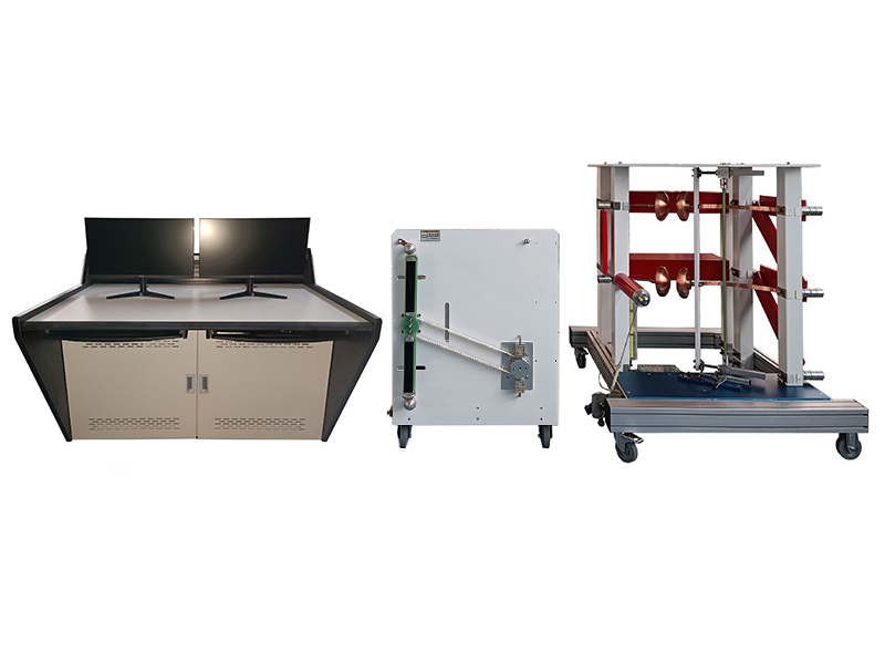 驗設備由沖擊電壓發生器本體、100kV直流充電裝置、DF-200kV400PF弱阻尼電容分壓器、計算機測量、觸摸屏控制系統等